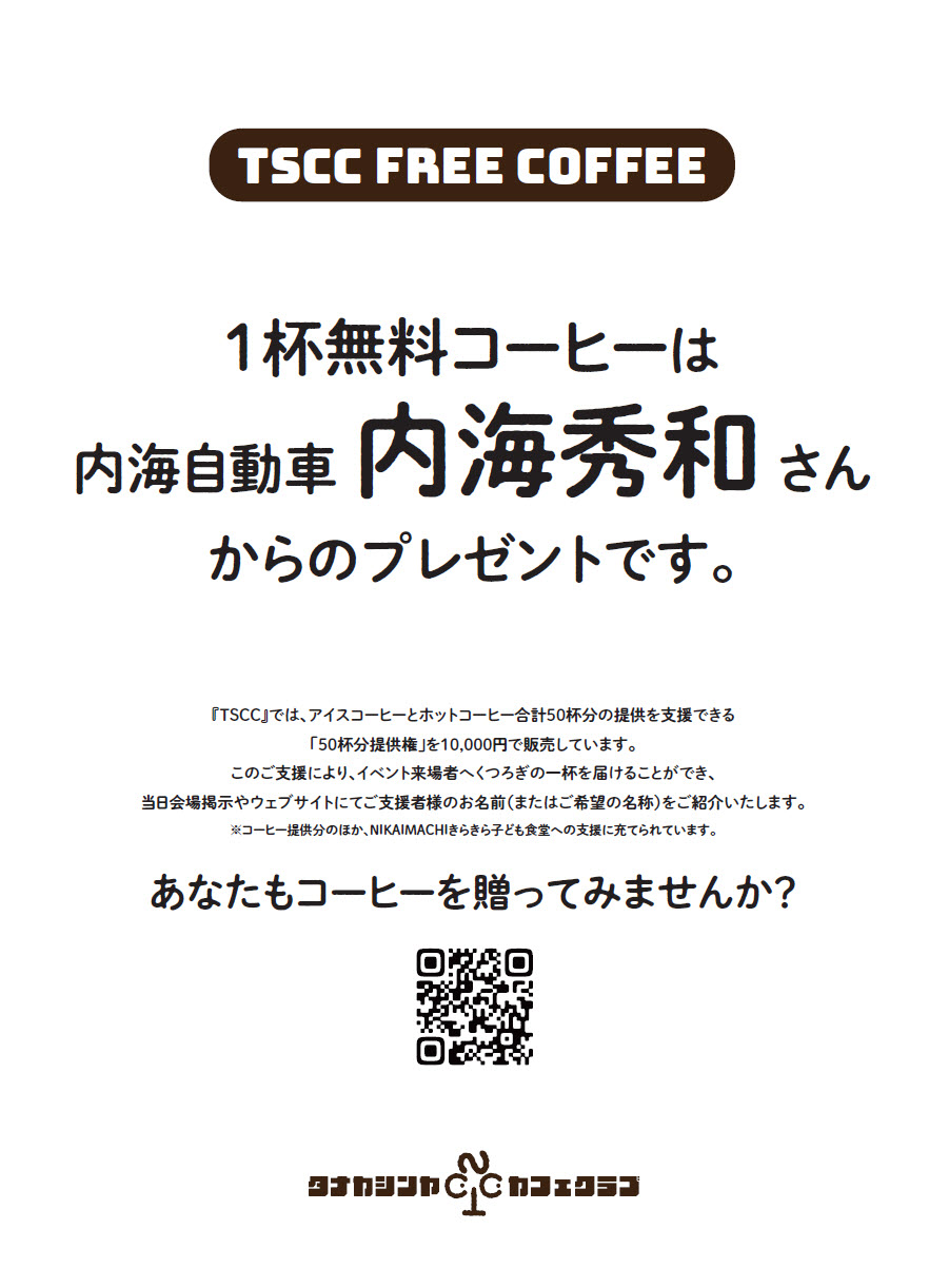 TSCC所属のオジサンたちが、「 日々の罪滅ぼし 」として「きらきら子どもフェス」に来られる老若男女に 無料でコーヒーを配りますヨ。